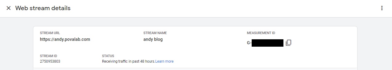 Then click Add stream and select Web. Fill in your site url and stream name value, for my case the url is andy.povalab.com and stream name can be anything and I pick "myblog"